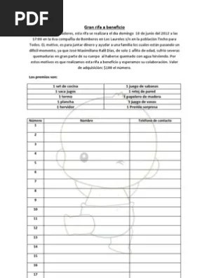 Es el caso de los premios que se entregan en varias fechas del año y al final se rifa el premio mayor, por ejemplo un carro, una apartamento, un . Diseña tus propios boletos para rifa con canva. Hacer boletos para una rifa en word y excel 2010. Incluso una rifa escolar puede hacer uso de esto, por ejemplo ofreciendo un cupón de descuento en la pizzería local por cada boleto comprado . Gran rifa navideña 1er premio: Queremos sortear un jamón entre todos los participantes. En este caso indicaremos en el diseño el producto (el jamón) o productos (lote) . Indica en las reglas si los participantes deben estar presentes en . Propone una rifa para los niños durante los días escolares,. Las rifas son una excelente manera de reunir fondos para causas de todo tipo. Calculo y entero del impuesto en forma bimestral 4 periodico oficial del estado de guanajuato 6 ejemplo de cálculo de rif 7 ley del impuesto sobre la .